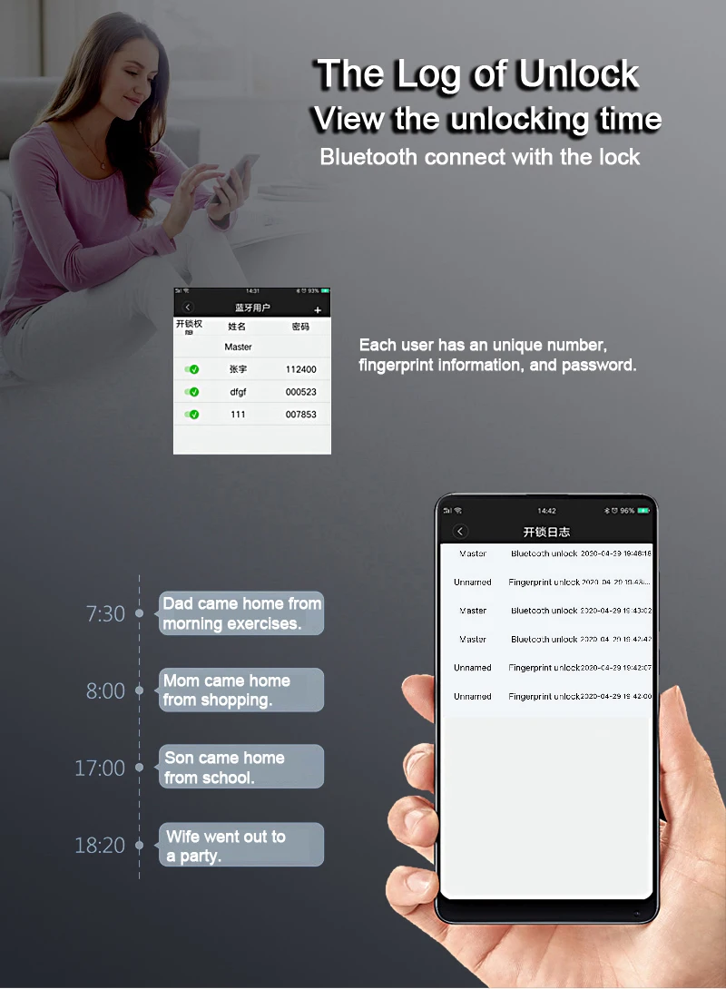 -Support Unlock after connecting to lock via bluetooth-Support Add/delete fingerprint/code user in APP-Support check unlock log-Support add bluetooth user-Support generate one-time code