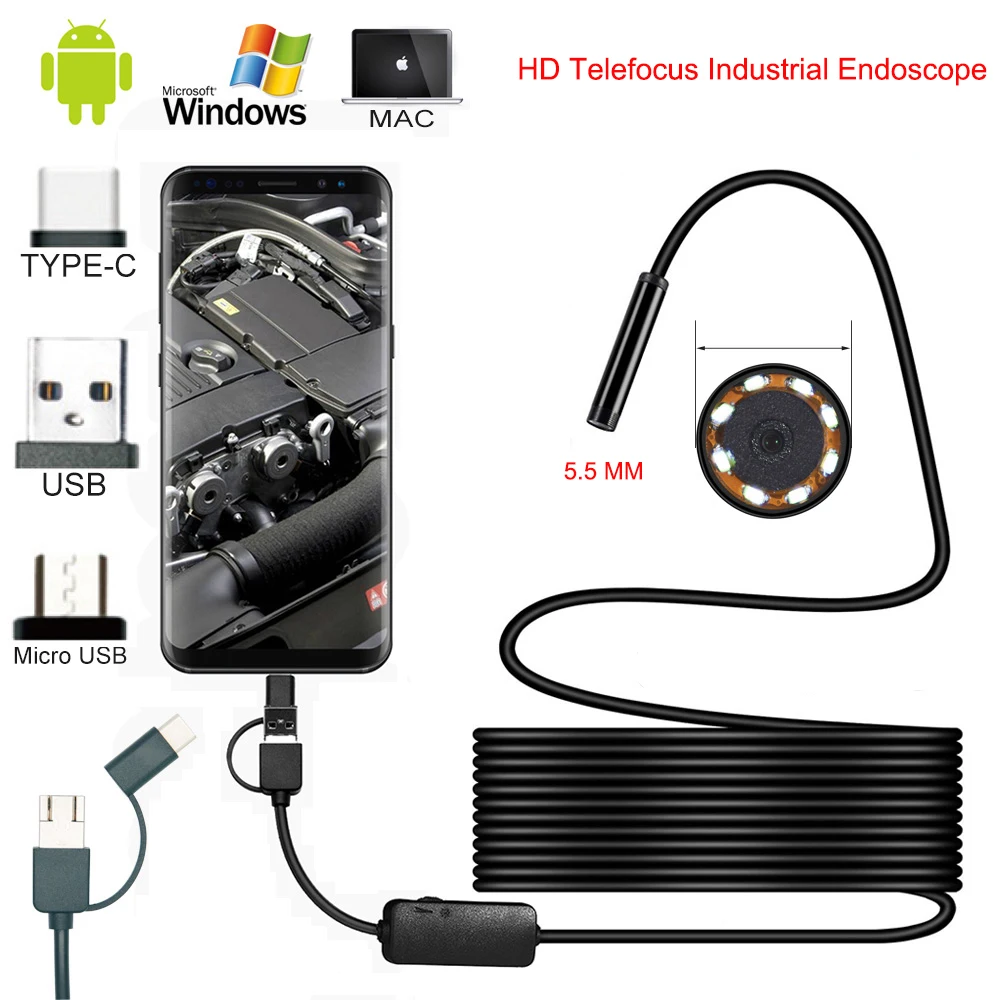 5.5mm HD Telefocus Industrial Endoscope Waterproof Soft Hard Cable Inspection Borescope Camera USB Type C For Android Phone 10M
