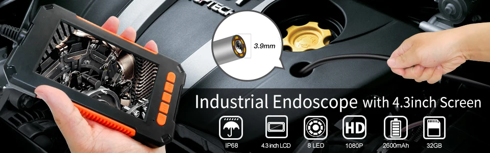 Industrial Endoscope 8.5MM 1080P HD Digital Dual Lens Borescope Camera Waterproof 4.3 Inch LCD Snake Camera with 32GB TF Card Industrial Endoscope Advantage 1. 4.3 inch LCD Screen & Solid Glass Screen:The inspection is equipped with 4.3inch color LCD screen,it does not require a bluetooth or WiFi connection,no signal instability and software crashes.It is made of solid glass,featuring protection from scratches,scrapes.