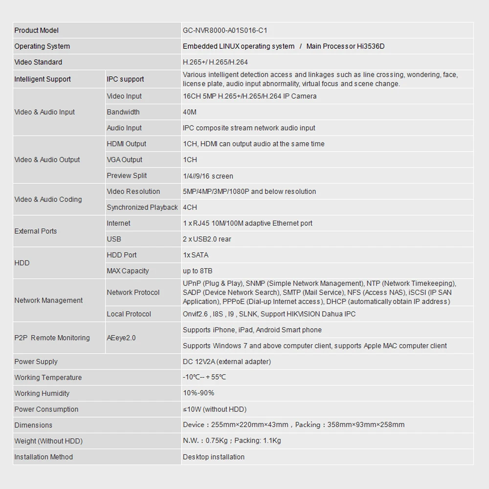 | G.Ccraftsman 16ch 5MP H.265 NVR Network Video Recorder 1 HDD 24/7 Recording IP Camera Onvif 2.6 P2P Security System AEeye |