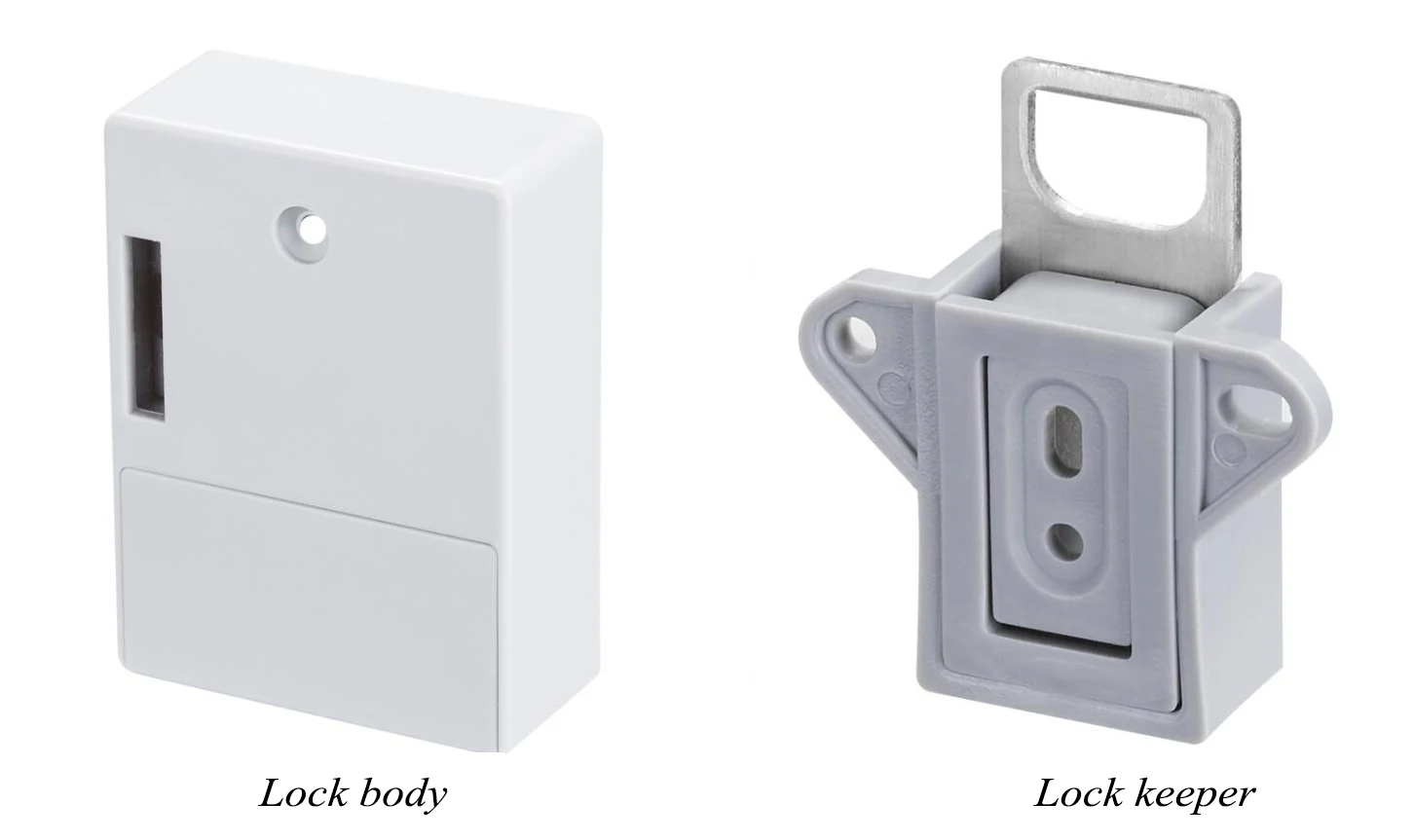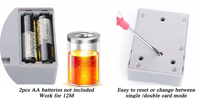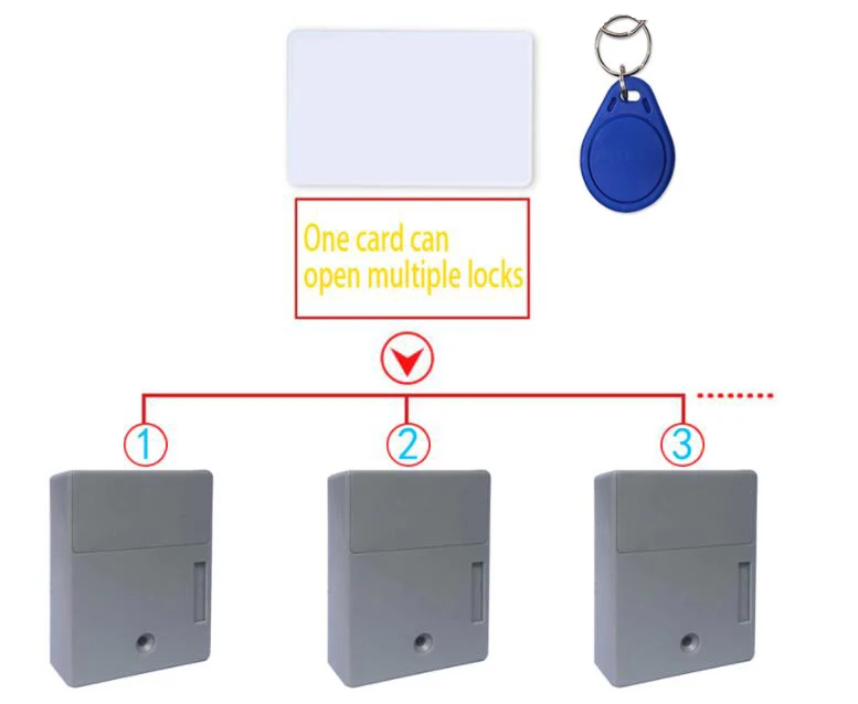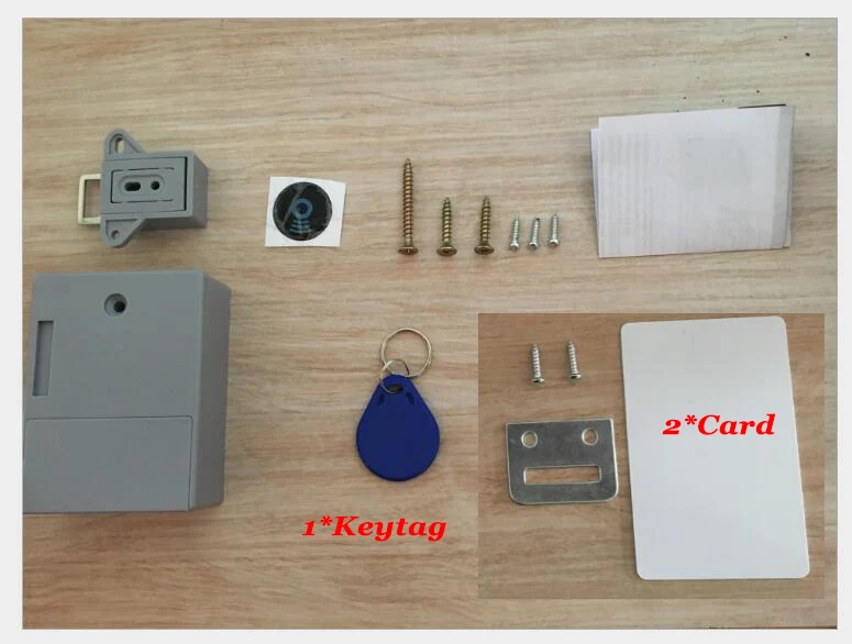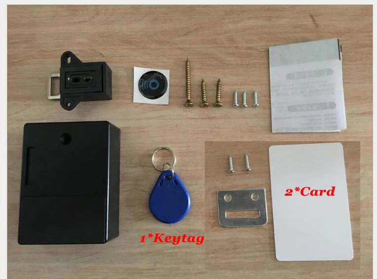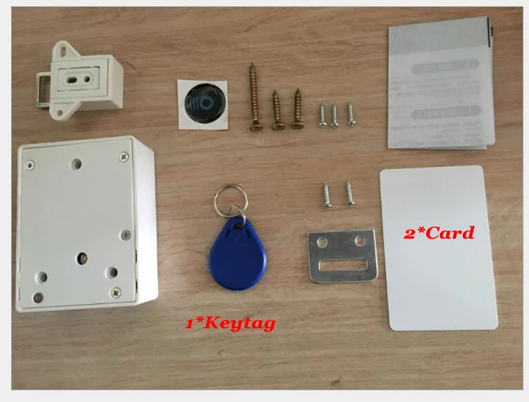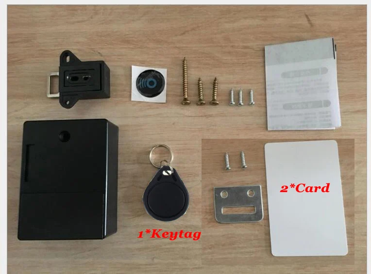 Note: All batteries in the lock are removed. Note: Test lock after battery has been installed. otherwise will fail to unlock after locked.Kit1: White lock+2pcs ID card + 1pcs Blue ID tagKit2: White lock+2pcs ID card + 1pcs Black ID tagKit3: White lock+2pcs ID card + 1pcs Blue ID tagKit4: White lock+2pcs ID card + 1pcs Blue ID tagParameters-Material: ABS-Power supply: 2pcs AA batteries (Not included)-Sensitive distance: 2.5cm for blue keyfob, 4.5cm for card. (Check your door thickness)- 2 mode to choose: unlock with 1 keyfob or 2 keyfob- Support unlock with multiple locks with 1 same keyfob-Suit for cabinet,drawer,locker,storage box and etc.for household or business:supermarket,sauna club,gym,swimming stadiums,library,factory and office.Package list:1*lock body1*lock keeper1*blue keyfob2*white ID card1*Iocation-indicating icon1*pack of scewsIf you want to change part in the package, like add more tag or card or chane tag to card, contact us please.