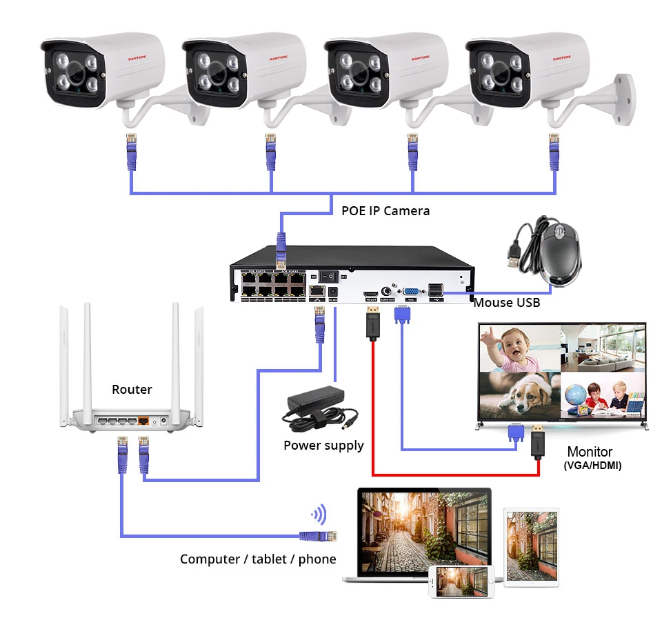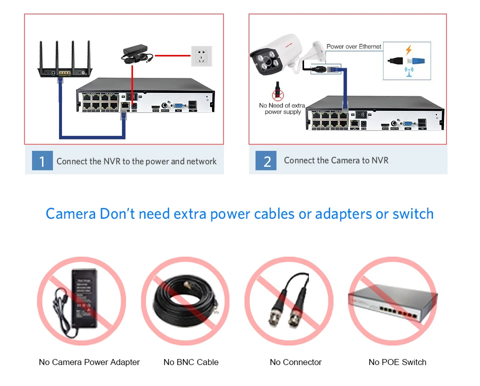 The NVR and IP Cameras are built with easy-to-install POE ports to make installation simple and cluter-free, Eash Camera is connected to the NVR via a single Ethernet cable which provides HD video transmission and power supply for the camera