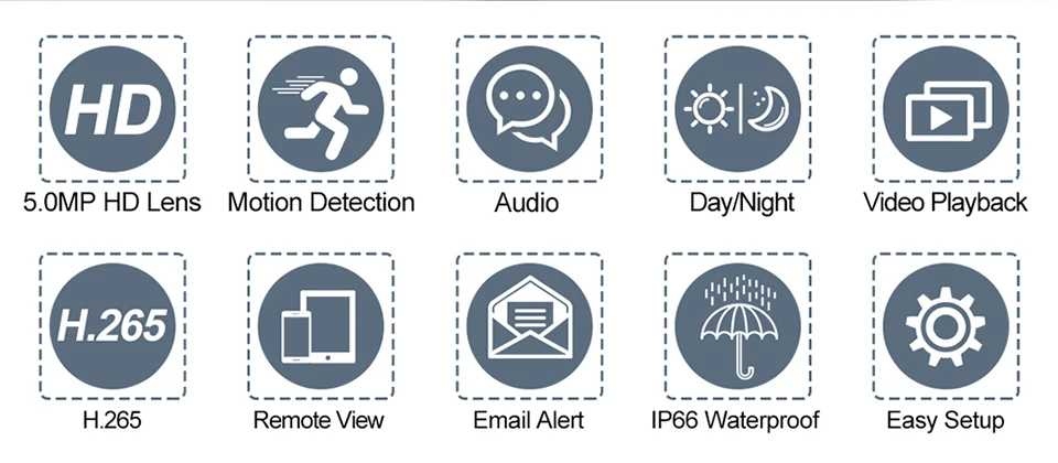 The metal casing is waterpoof and sealed Multiple alarm detection and notification methodsSupport Face Detection, Motion Detection, Camera lens was covered Alarm detection method, Support Buzzer, Email and APP push notification methods.