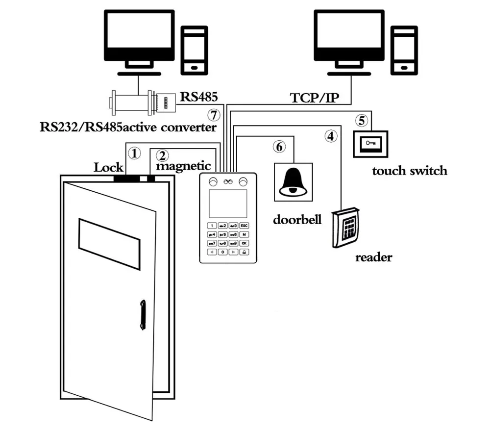 Display screen: Color screen, 2.8inch TFTFingerprint collector: High-precision anti-dry and wet back optical collectorFacial capacity: 500 sheetsFingerprint capacity: 1500 piecesPassword capacity: 500 piecesCard capacity (optional) : 500 piecesRecord capacity: 60,000 articlesCommunication method: U-Disk,TCP/IP(optional)Verification method: Fingerprint, password, RFID cardU disk upload / download data: Stand byFingerprint Intelligent Learning Update: Stand by Identify the angle: Full angle recognitionEffective collection area: 16*16mmIdentify speed: ≤ 0.5secondRejection rate (FRR): ≤0.1%Recognition rate (FAR): ≤0.0001%Way of working: Offline / onlineLanguage display: Chinese English Traditional Chinese, Spanish, Korean, Japanese, Turkish, Indonesian, Italian, Thai.Voice prompts: High-definition human voiceWorking environment: Temperature: -20 ° C to + 50 ° CWiegand signal: 26/34 Output and InputAccess Control Interface for: 3rd party electric lock, door sensor, exit button, alarm, Door BellMachine size: 200 x 88 x 28mmWiring Diagram