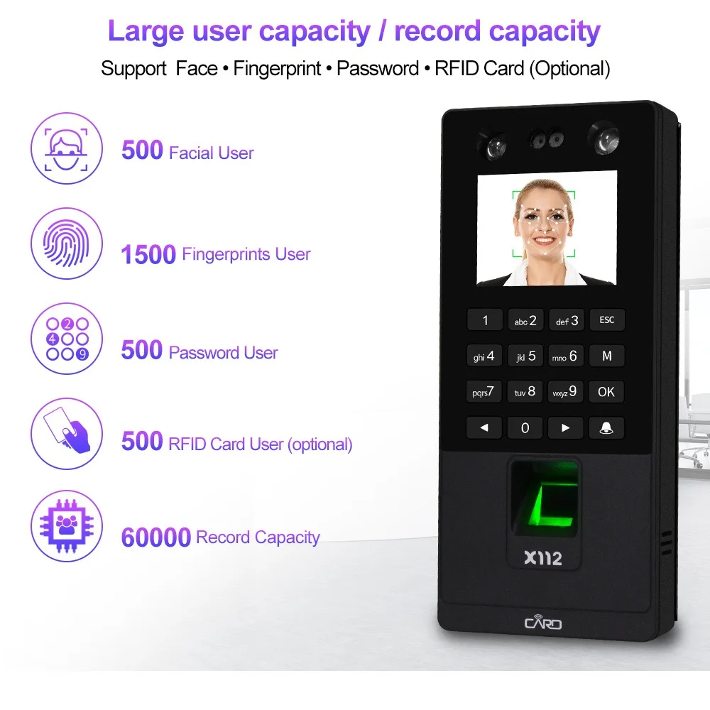 1. 2.8inch TFT Color screen.2. Strictly follow the national security product standard.3. Face recognitio with its high-resolution infrared night vision light and professional color duo camera, the terminal can carry out quick verification in any environment.4. The Energy-saving fingerprint sensor and power management function, makes the product perfect.5. Support 500 facial ,1500 fingerprints, 500 password, 500pcs RFID card user capacity, 60000 record capacity6. Supports face, fingerprint, password, RFID card and various combination methods, in order to satisfy the demands of different users.7. T9 input method editors, on the machine name, Department, frequency and other information, can be directly output attendance reports, user operation is simple8. Support TCP/ IP communication method. Support USB Flash drive upload download.9. Has Wiegand 26/34 input/output, TTL input/output, relay output, door bell button.10. Humanized language indication reminder.11. Support Chinese language, Traditional Chinese, English, Spanish, Korean, Japanese, Turkish, Indonesian, Italian, Thai.12. Suitable for the entrances and exits of office, factory, hotel, school, etc.Intelligent Face Recognition