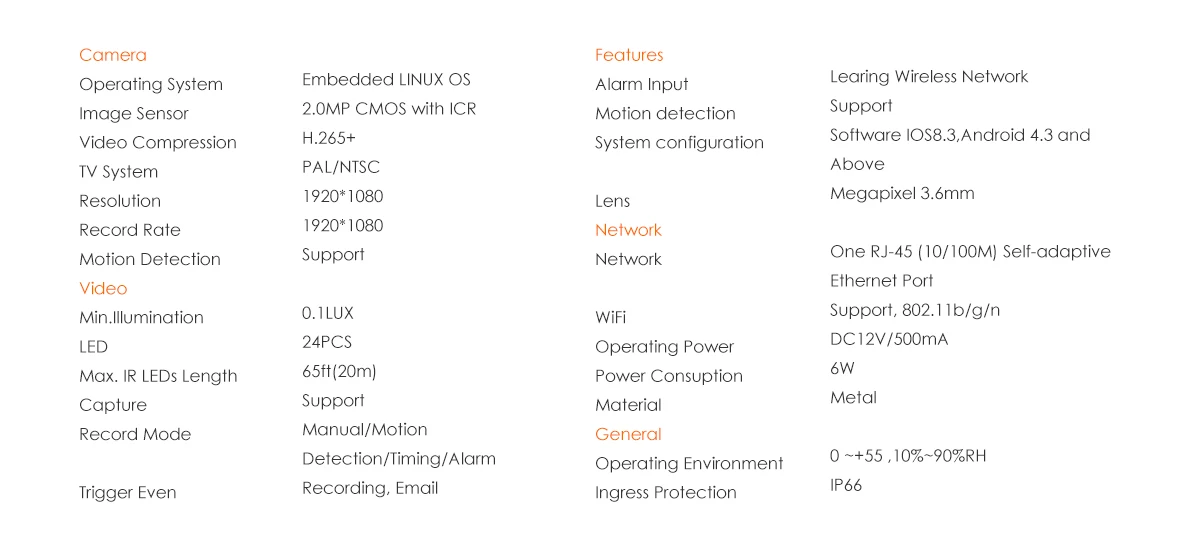 (1)Free from the hassle of long distance wiring(2)Advanced H.265+ High Efficiency Video Compression,(3)Remote Access & Motion Detection(4)Customize Each Camera with Different Record Modes(5)Made by IP66 steady heavy-duty aluminum housing material(6)3 meter long power adapter for each camera(7)Support multiple language:English, Russian, Japanese, Spanish, German, Portuguese, French,etc(8)Two USB ports designed,more convenient.(9)Provide EU/US/UK/AU plug,as default,depend on your country.(10)Supports wireless transmission and wired transmission via LAN cable as well.Free From Complex Wiring