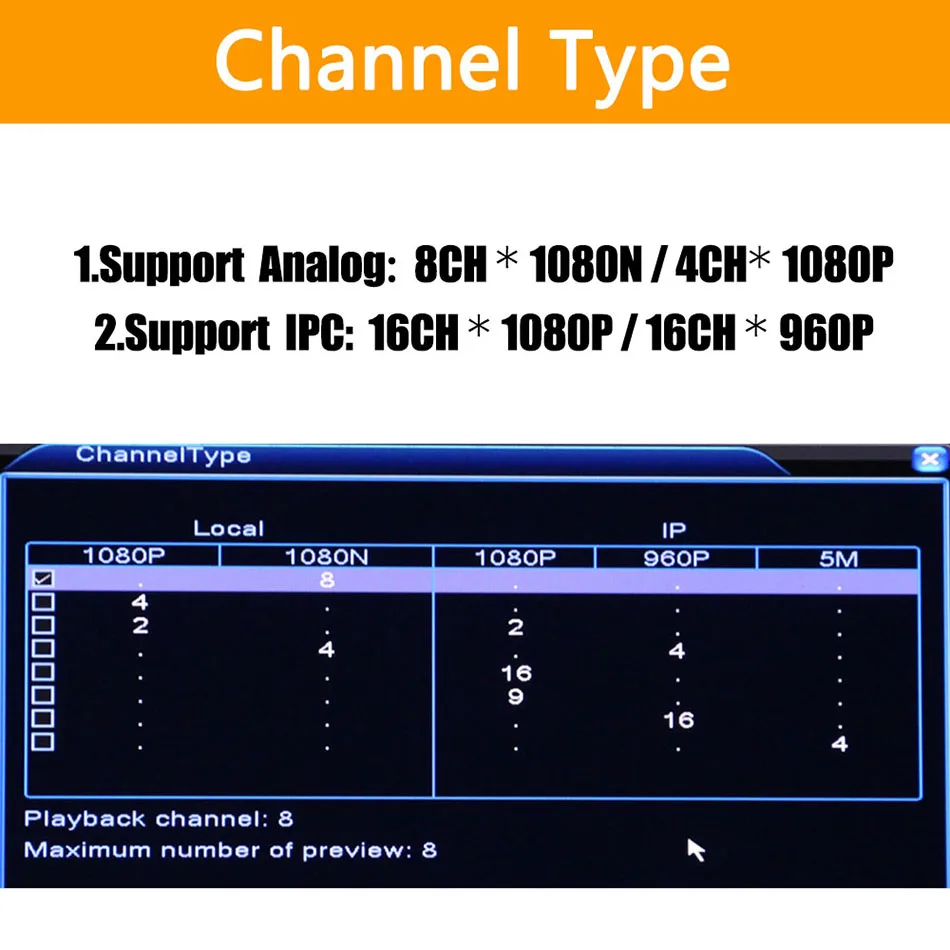 | 5 in 1 8ch*1080N AHD DVR Surveillance Security CCTV Video Recorder DVR Hybrid DVR For 720P/960H Analog AHD CVI TVI IP cameras |