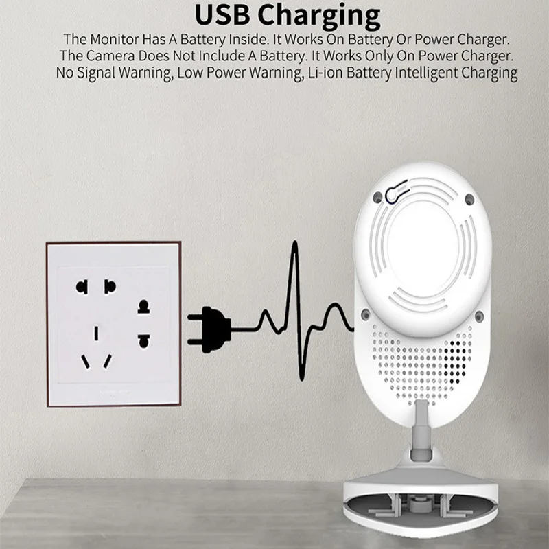 Display: 4.3 inch Sensitivity: -90dBm Modulation Mode: GFSK Service Time: 8 hours Package weight: 0.50 kg Power Consumption: 150mA Sensor: CMOS Sensor size (inch): 1/3 Valid Pixel: 1980 x 1080pxl Battery: 500mAh Li-polymer battery Min. Illumination: 0 Lux ( IR On ) Night Vision Distance: 15 FT ( 5m ) Transmission Power: 17dBm Feature: Music,Night Vision,Remote Control Transmission Freq.: ISM 2400 -2483.5 MHz Power: Input: 110V - 240V, working voltage: 5V / 1A DC Unobstructed Transmission Range: 160ft / 50m indoor, 850ft / 260m outdoor, line of sight -Built-in lullabies may help the parent comfort the baby fall into a sleep. -Temperature monitoring. Know your baby's room temperature all the day long without worries. -Two way audio between the camera and monitor, you can talkback to baby. -Keep an eye on baby all night long with automatic night vision. -Up to 8 hours of battery life (in Vox mode). No need to charge the battery for the monitor in the whole night in Vox mode. -Small size, portable design, convenient to carry. -Support multi-language, English, French, Spanish, Italian, Germany. 1 x Camera 1 x Monitor 2 x Power Adapter 1 x English User's Guide Describe the details of the selling point above, attracting and providing trust to your potential users. USB Type C to A Cable + Adapter + Earphone Headset + User Manual + Warranty Card.