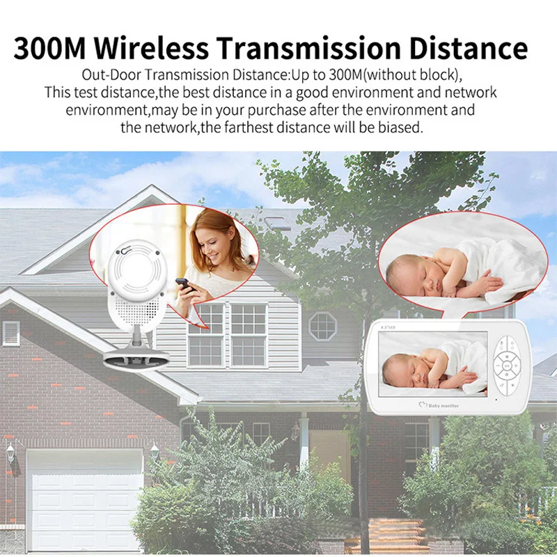 Display: 4.3 inch Sensitivity: -90dBm Modulation Mode: GFSK Service Time: 8 hours Package weight: 0.50 kg Power Consumption: 150mA Sensor: CMOS Sensor size (inch): 1/3 Valid Pixel: 1980 x 1080pxl Battery: 500mAh Li-polymer battery Min. Illumination: 0 Lux ( IR On ) Night Vision Distance: 15 FT ( 5m ) Transmission Power: 17dBm Feature: Music,Night Vision,Remote Control Transmission Freq.: ISM 2400 -2483.5 MHz Power: Input: 110V - 240V, working voltage: 5V / 1A DC Unobstructed Transmission Range: 160ft / 50m indoor, 850ft / 260m outdoor, line of sight -Built-in lullabies may help the parent comfort the baby fall into a sleep. -Temperature monitoring. Know your baby's room temperature all the day long without worries. -Two way audio between the camera and monitor, you can talkback to baby. -Keep an eye on baby all night long with automatic night vision. -Up to 8 hours of battery life (in Vox mode). No need to charge the battery for the monitor in the whole night in Vox mode. -Small size, portable design, convenient to carry. -Support multi-language, English, French, Spanish, Italian, Germany.
