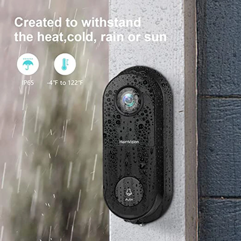 Securing Your Front Door Wherever & Whenever You Are! 3MP/2KFull HD, 166° wide-angle view, presenting you clear and large view images Human detection + instant message alerts, keep you updated on what is happening when someone is passing by your door Automatically switches to night vision mode, protecting you and your family, 24/7 day and night IP65 weatherproof, rest assured to install it outside your door, it keeps recording sun or snow, rain or storm Wireless chime comes with the video doorbell, put it anywhere in your dining room, bedroom or kitchen, you won't miss any visitors More useful features are waiting for you to explore.. 【3MP/2K Ultra HD & Enhanced Night Vision】HeimVision video doorbell camera is adopted an all-glass lens with HDR and distortion correction, which present you a 1080P full HD clear picture quality and 166° wider viewing. Equipped with IR sensor and LED, day or night, rain or shine, the camera can automatically switch the light to ensure you a crystal view, it secures your front door 7/24. 【AI Human Detection & Instant Message Alerts】HeimVision wireless doorbell is equipped with PIR motion and human detection sensors. Instant message alerts will be pushed to your mobile device when someone passes by your door and triggers the human detection sensor, the detection distance, and sensitivity (low/ high) are adjustable as per your preference, you won't miss anything that matters and not be bothered by false alert. For example, a truck runs far away your house won't bother you anymore. 【2-Way Audio & Remote Control on APP】Built-in full-duplex microphone and speaker allows for real-time 2-way talk and enables you to see, hear and speak with visitors from your mobile phone, tablet, or laptop wherever you are, no matter you are engaged in working or jogging in the park, you can keep an eye on your door and remote control it on your APP. What's more, you could also prerecord 3 voice messages for quick response to visitor when it is inconvenient for you to answer the phone. 【2 Storage Options & Weatherproof】 IP65 rated weatherproof , HeimVision security door bell protects every inch of your home through every season in snow or shine. For video storage, it supports TF card, max. 128GB ( Not Included). It also supports encrypted cloud storage with a one month free trial.