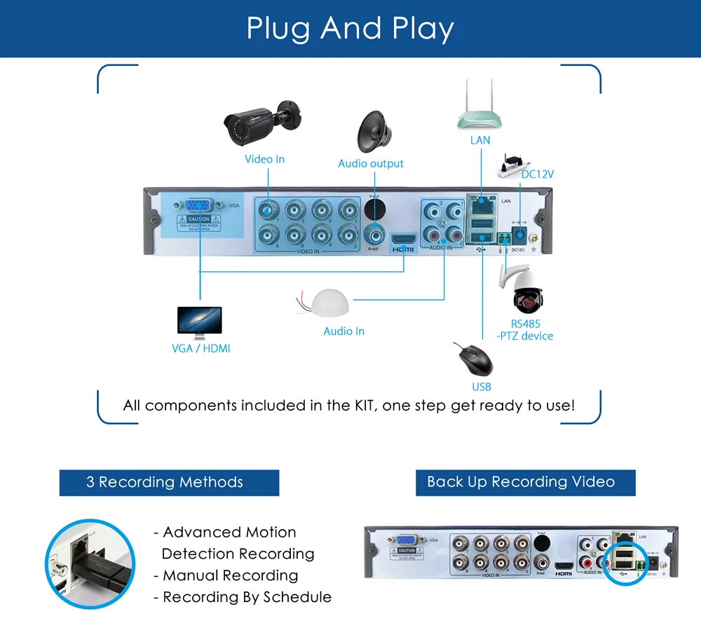 Ideal for home or business 1080P(1920 x 1080) offers exceptional Full HD resolution and quality enhancing efficiency and monitoring capabilities. New generation 18pcs SMD lights and infrared radiation for 24-hour vigilance,aood reassurance in terms of preventing security threat. The IR cut will enhance the video quality(trurer color and clearer picture) both day and night. Adjust the angle and Vandal-proof wire protection cable inside The camera's excellent adaptability allows it to perform flawlessly indoors/outdoors. All compenents included in the KIT.One step get ready to use. We provide 1 year warranty for DVR and Camera. Any question please feel free to contact us, communication is much more efficiently than opening a dispute.