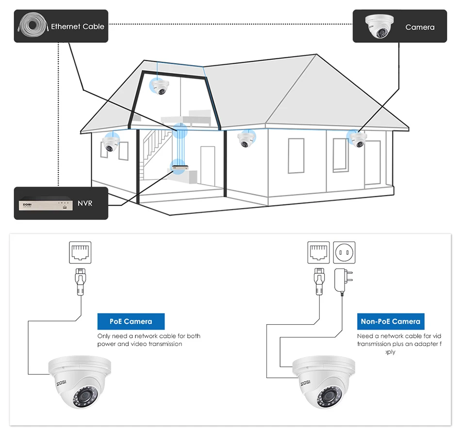 With only a single ethernet cable connecting each IP camera to the NVR for both power and video transmission, PoE (Power over Ethernet) security system allows you to DIY the camera position anywhere you want. No need of a separate power adapter for power supply of each camera, truly freeing you from messy and tiring cablings.